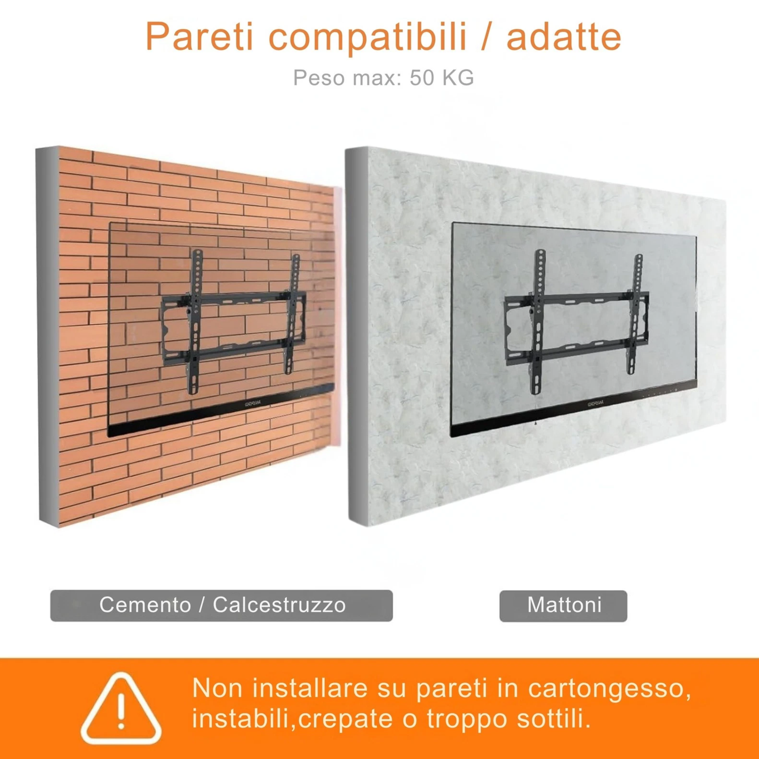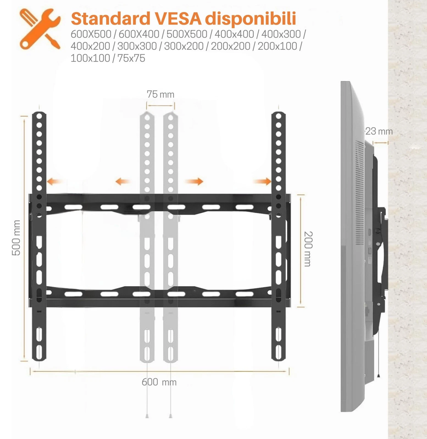 Libera spazio e goditi una visione ottimale con la nostra staffa TV universale da parete. Progettata per Televisori e Monitor da 40 a 85 pollici e compatibile con gli Standard VESA da 75x75 mm fino a 600x500 mm. Robusta e sicura può supportare dispositivi fino a 50 kg, ed è la scelta ideale per fissare la tua TV/Monitor al muro con stile e praticità. Massimizza lo spazio e l'angolo di visione con facilità!
